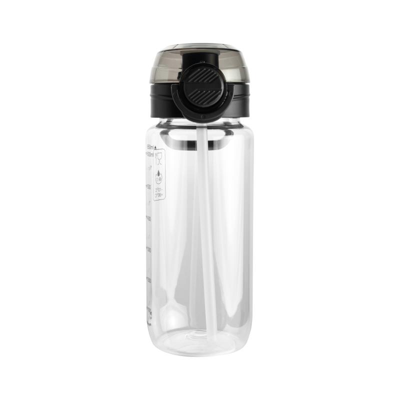 Sportowa butelka Schwarzwolf wykonana z tritanu, w kolorze przezroczystym, z czarną zakrętką i uchwytem do zawieszania. Pojemność butelki wynosi 650 ml, a jej konstrukcja wspiera zdrowy styl życia, ponieważ nie zawiera BPA. Oferuje dwa sposoby picia: przez ustnik lub słomkę. Nadaje się do napojów zimnych i ciepłych w zakresie temperatur od -10°C do 80°C.