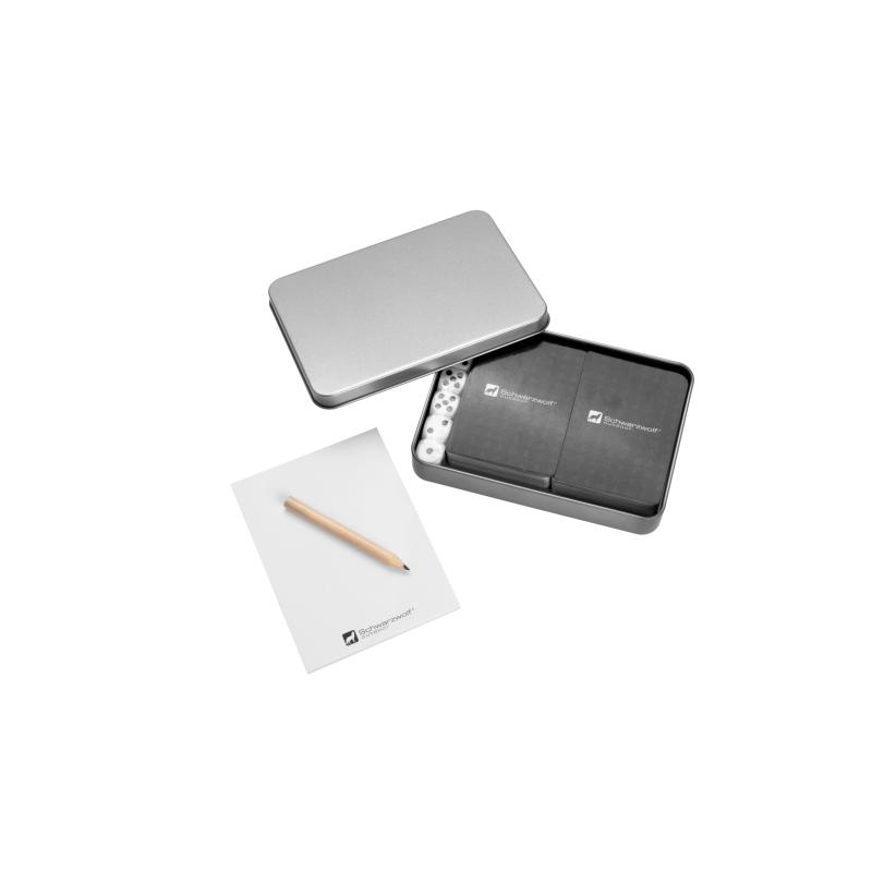 Zestaw podróżny do gry w karty i kości, zapakowany w blaszane pudełko. Zestaw składa się z 2 talii 54 kart z wodoodporną powierzchnią, 6 kości do gry i 15 karteczek do notowania oraz ołówek.