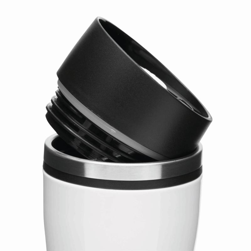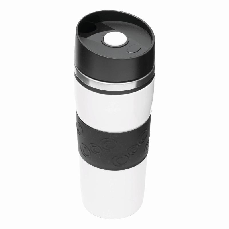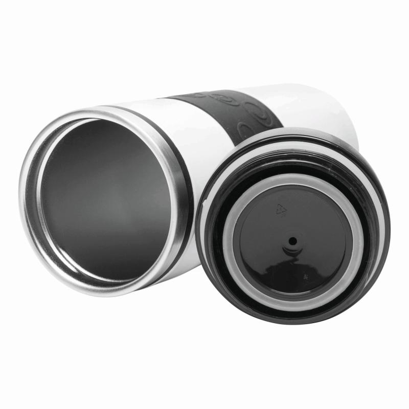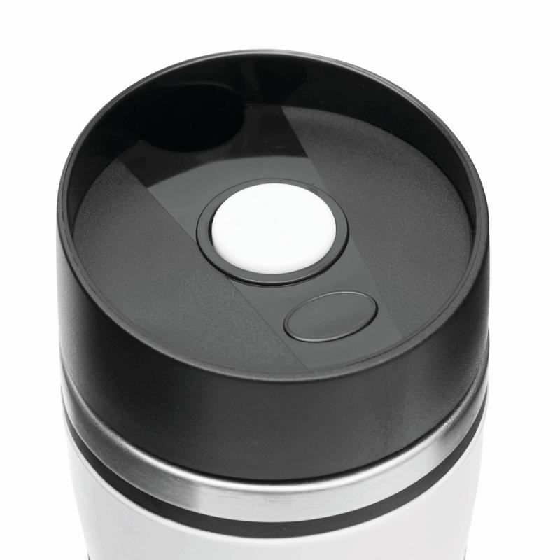 Kubek termiczny ARABICA wykonany ze stali nierdzewnej na zewnątrz i wewnątrz. Kolorowe odkręcane wieczko, przycisk OPEN/CLOSE i wbudowany otwór do picia, kolorowa, silikonowa tuleja i gumowy spód dla lepszej przyczepności, pojemność ok. 400 ml.