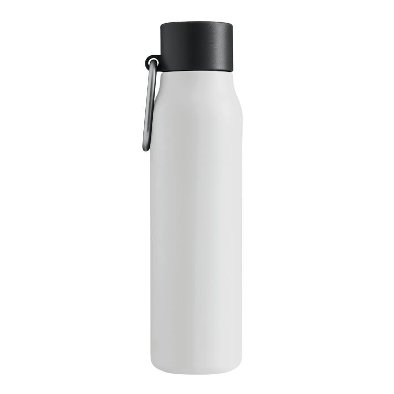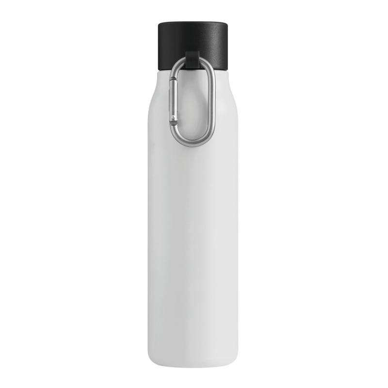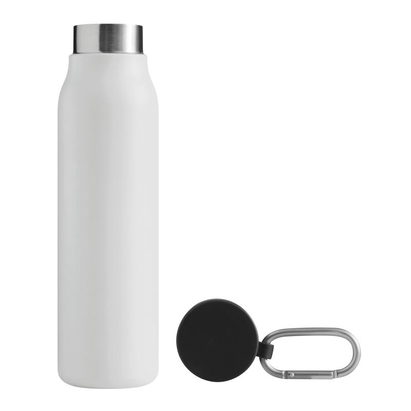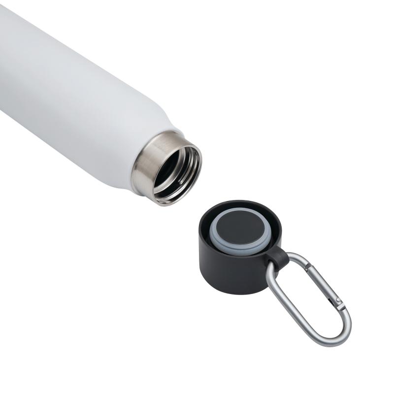 Próżniowa butelka ALPINE PEAK z podwójną izolacją. Wewnątrz wykonana ze stali nierdzewnej z recyklingu, na zewnątrz ze stali nierdzewnej. Posiada plastikową pokrywkę z bezpieczną zakrętką, silikonowy pierścień uszczelniający i karabińczyk (karabińczyk NIE nadaje się do wspinaczki). O pojemności ok. 550 ml. Utrzymuje ciepło przez ok. 8 godzin i zimno nawet do 12. Zapakowana jest w pudełko.