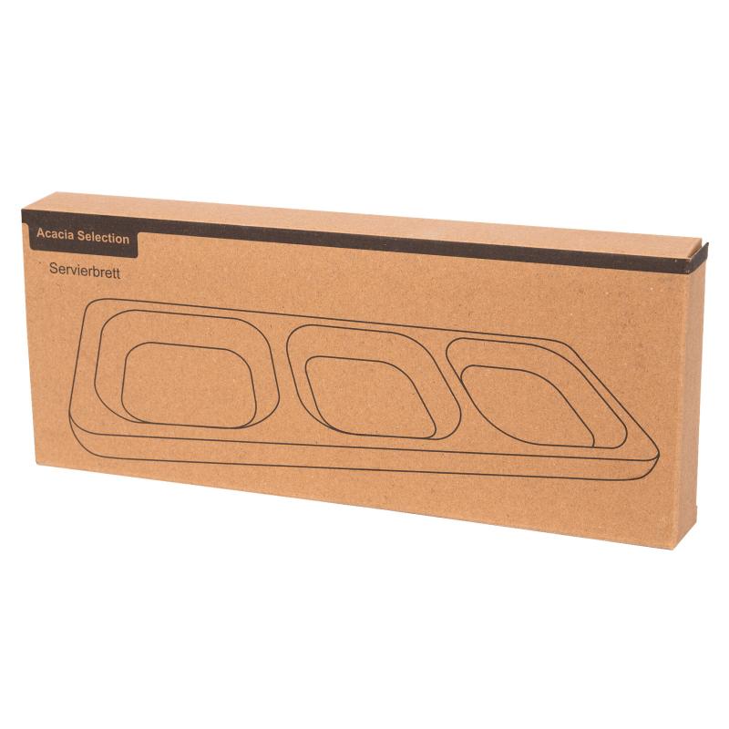 Taca do serwowania ACACIA SELECTION. Wykonana jest z olejowanego drewna akacjowego. Posiada 3 wygodne przegrody, np. na orzechy czy słodycze.