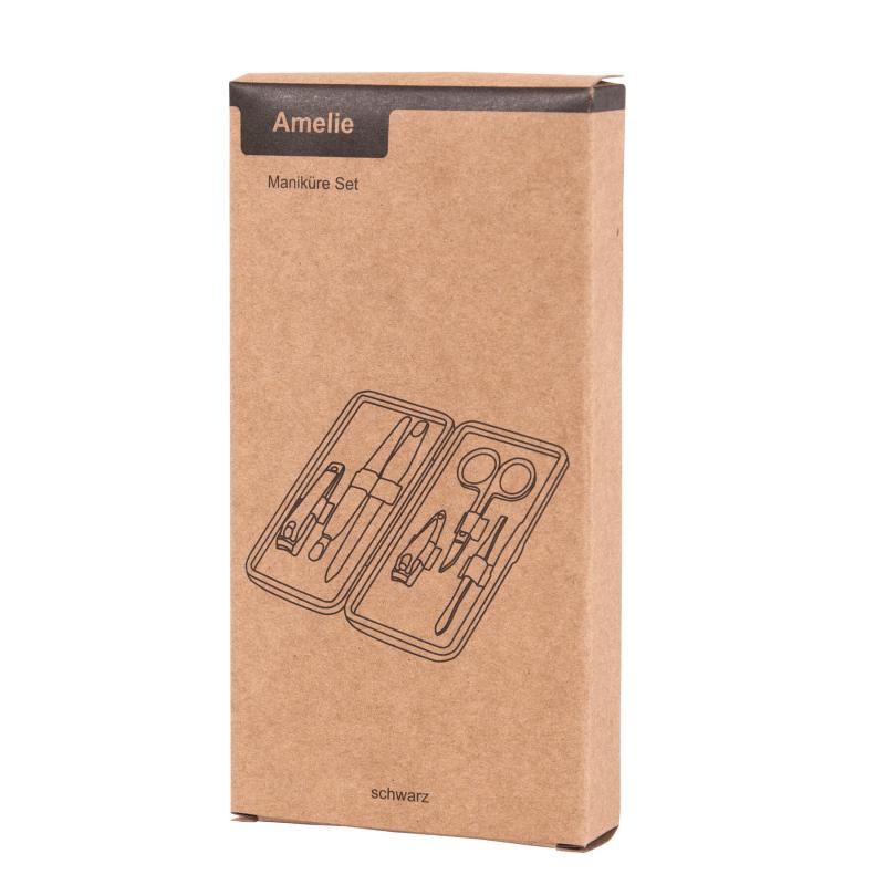 Elegancki zestaw do manicure AMELIE zawiera nożyczki, pilniczek, pęsetę, małe i duże cążki, łopatkę do manicure. W owalnym etui otwieranym przyciskiem.