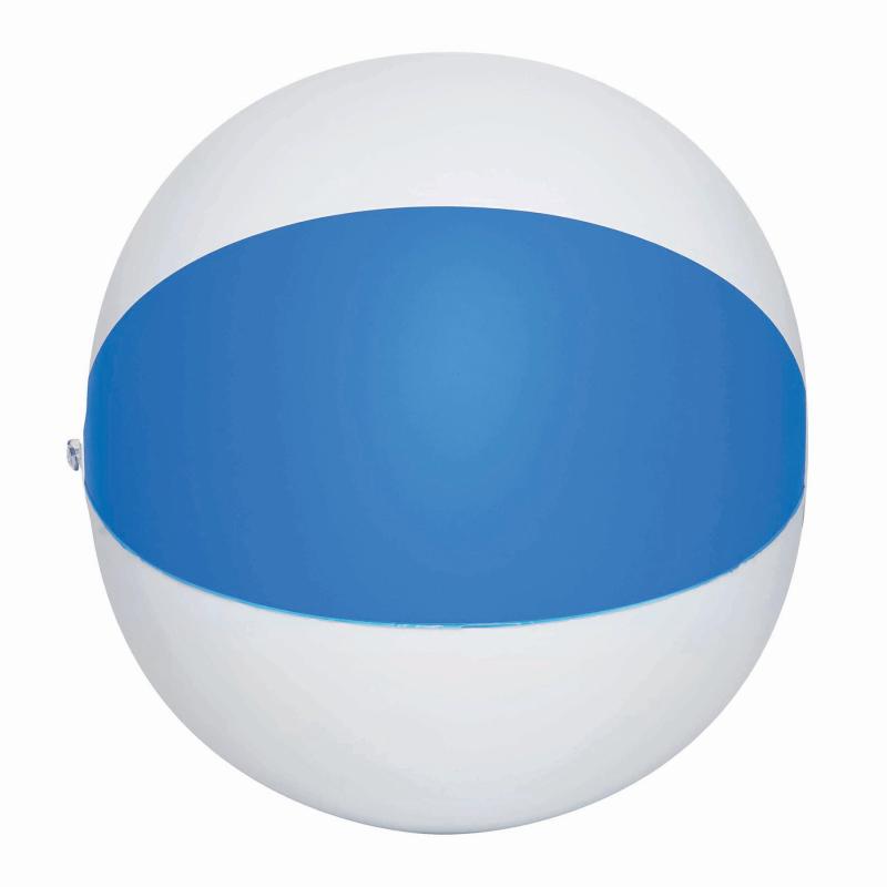 Nadmuchiwana piłka plażowa ATLANTIC z białymi i kolorowymi panelami. Napełniona powietrzem ma średnicę ok. 28 cm.