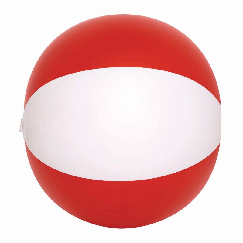 Nadmuchiwana piłka plażowa ATLANTIC z białymi i kolorowymi panelami. Napełniona powietrzem ma średnicę ok. 28 cm.