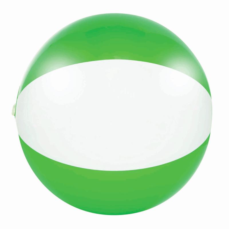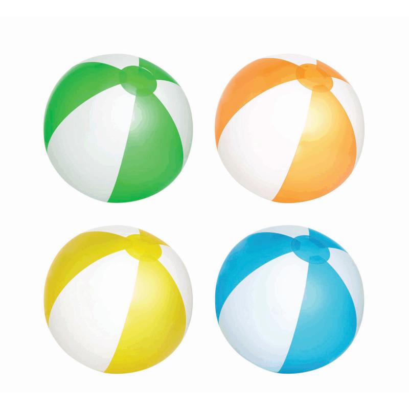 Nadmuchiwana piłka plażowa ATLANTIC SHINY z białymi i kolorowymi, półtransparentnymi panelami. Napełniona powietrzem ma średnicę ok. 28 cm.