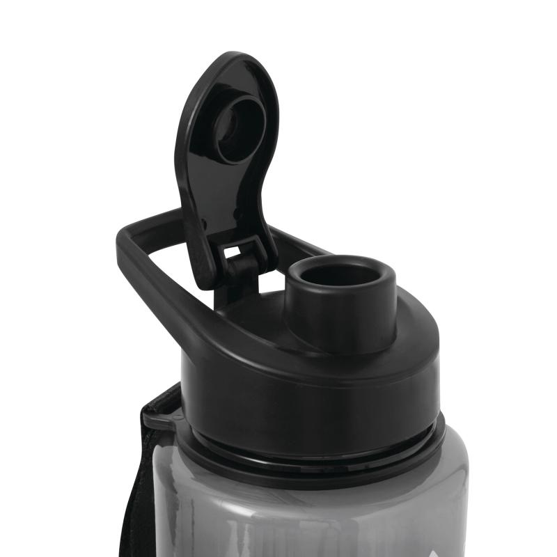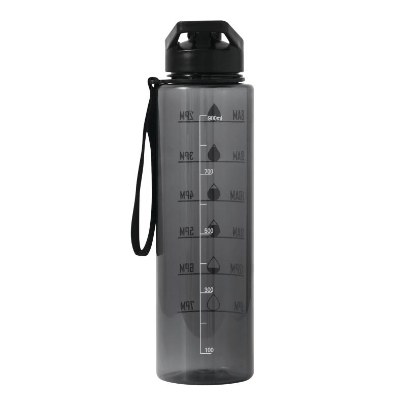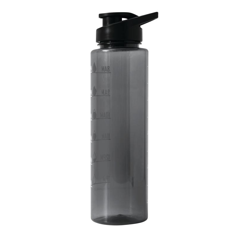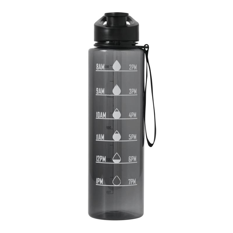 Sportowa butelka na wodę AQUA LEVEL. Przezroczysta, kolorowa butelka wykonana z wytrzymałego PETG. Ma dopasowaną kolorystycznie plastikowa zakrętkę z silikonowym pierścieniem uszczelniającym i odchylany ustnik do picia oraz uchwyt do przenoszenia. Posiada motywującą skalę czasu i objętości wody (pora dnia/ml) oraz pasek na rękę. O pojemności ok. 1000 ml.