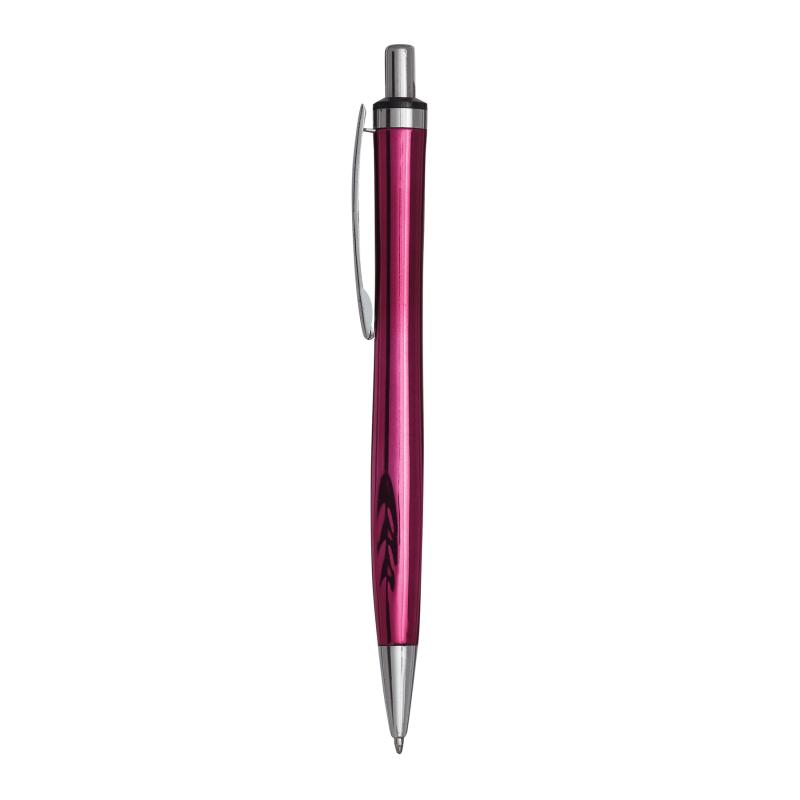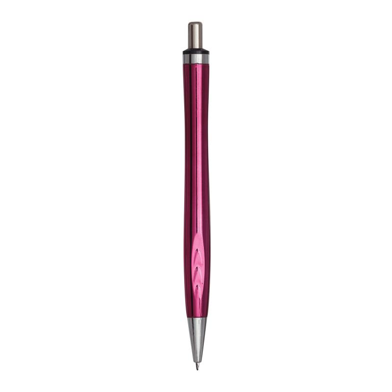 Długopis ASCOT z połyskującym korpusem, metalowym klipem, mechanizmem przyciskowym i niebieskim tuszem.