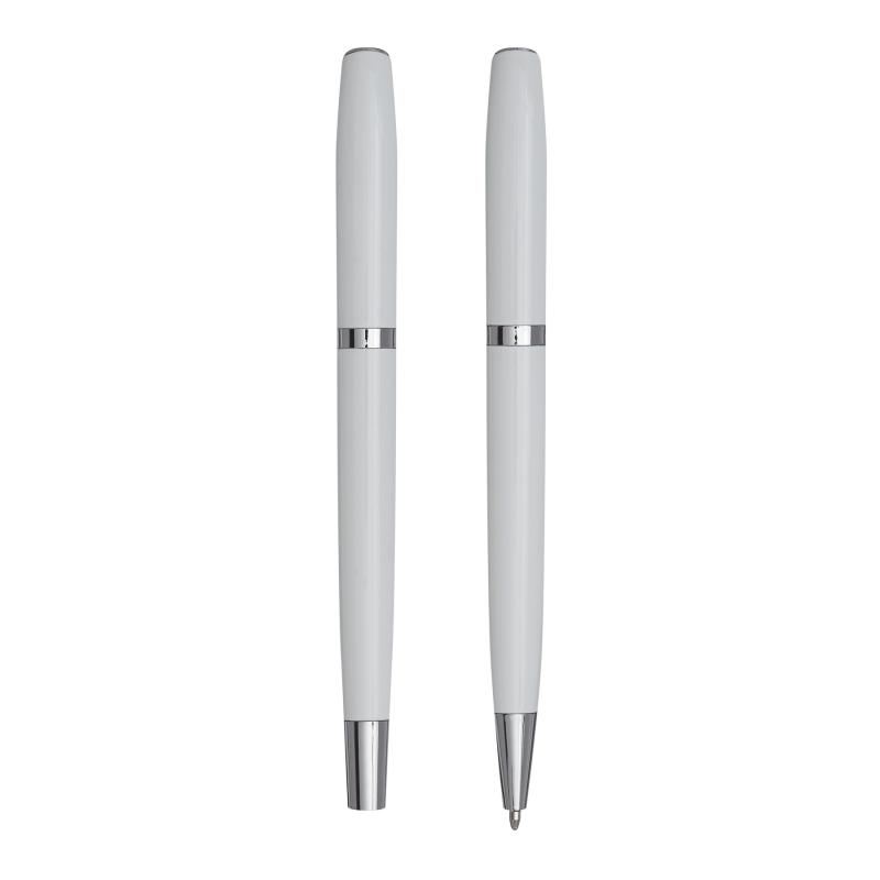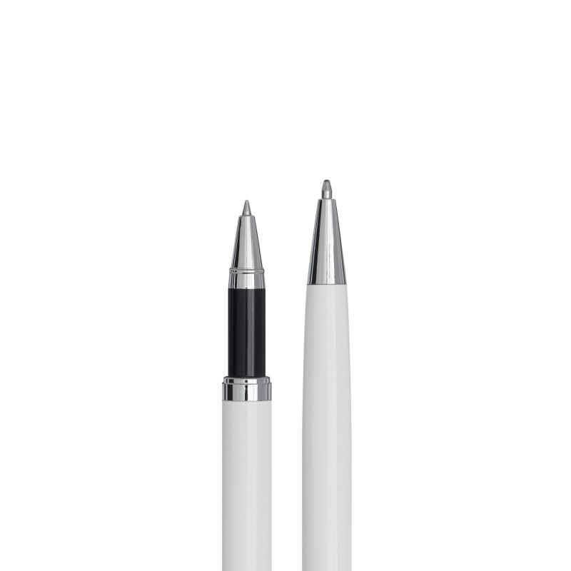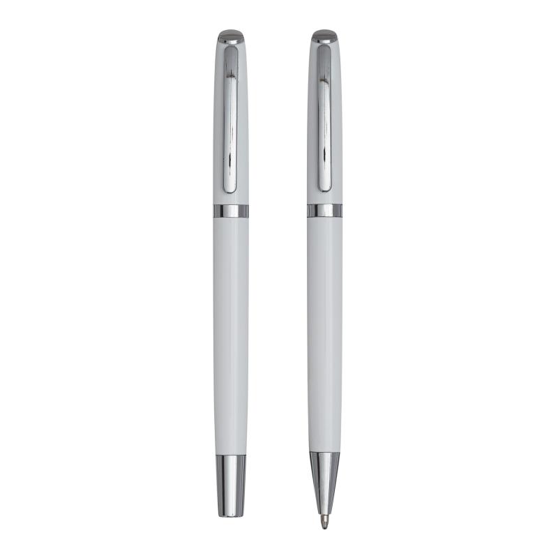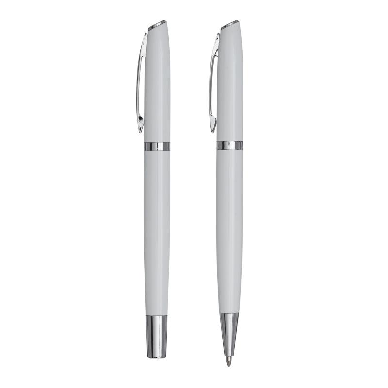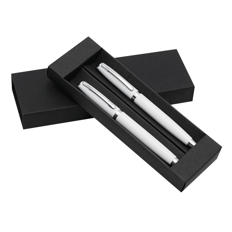 Zestaw do pisania ALPHABET składa się z długopisu z mechanizmem obrotowym i pióra kulkowego, czarny tusz, pakowany w pudełko.