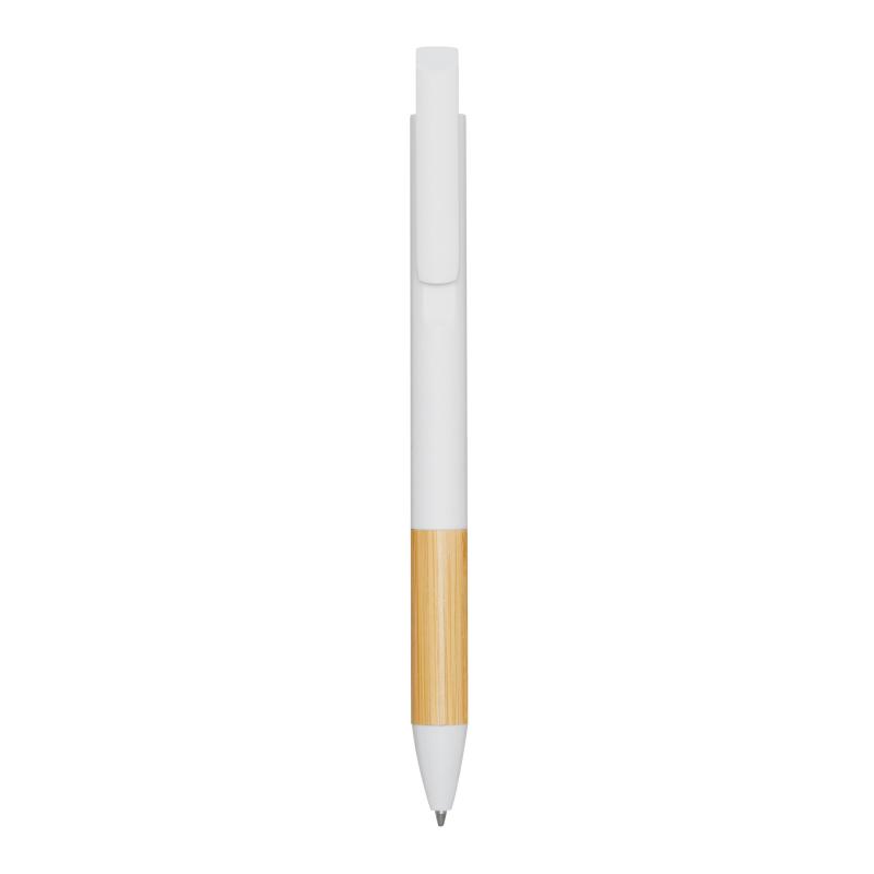 Długopis ANDANTE. Posiada korpus wykonany z plastiku pochodzącego z recyklingu, mechanizm typu push, lakierowany bambusowy uchwyt i niebieski tusz.