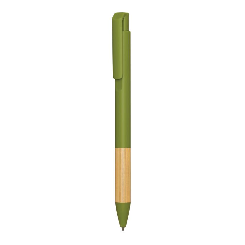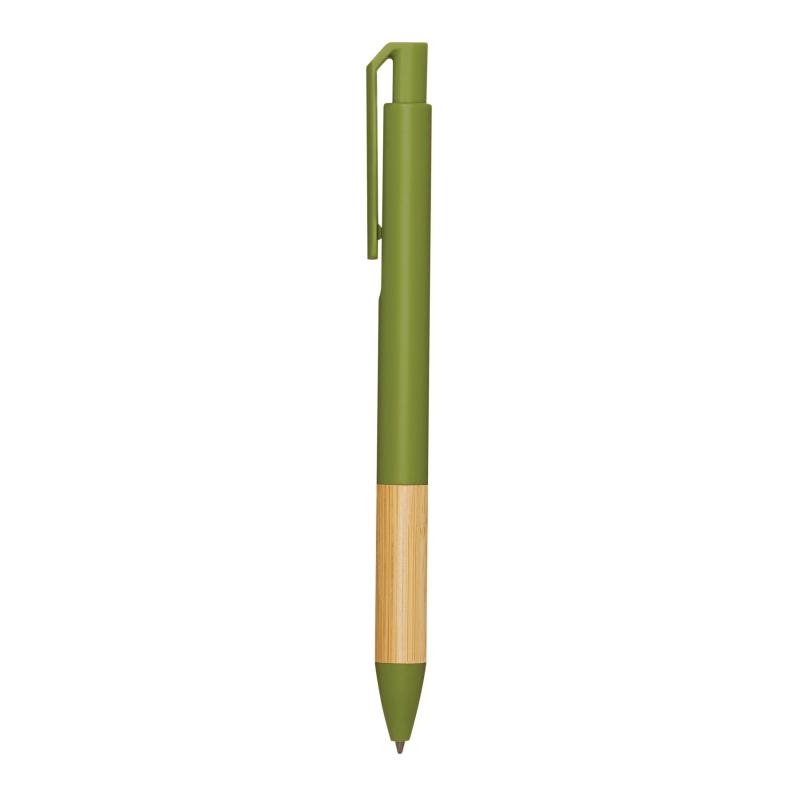 Długopis ANDANTE. Posiada korpus wykonany z plastiku pochodzącego z recyklingu, mechanizm typu push, lakierowany bambusowy uchwyt i niebieski tusz.