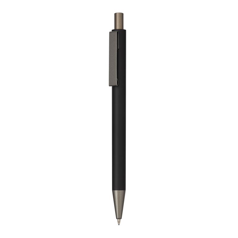 Aluminiowy długopis ALLEGRO. Ma matowy, metalowy korpus, mechanizm typu push, duży wkład z niebieskim tuszem.