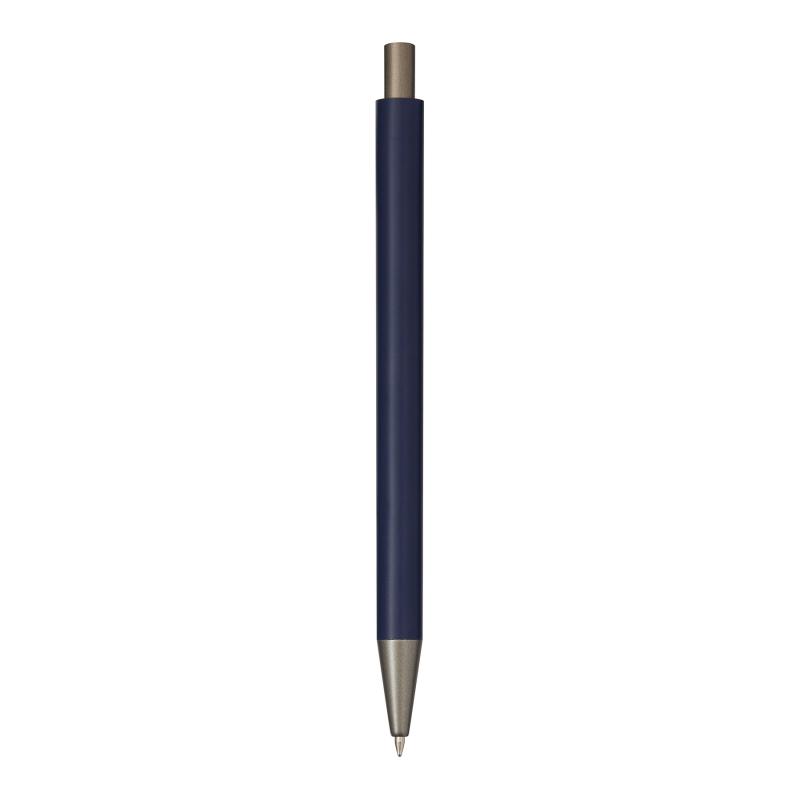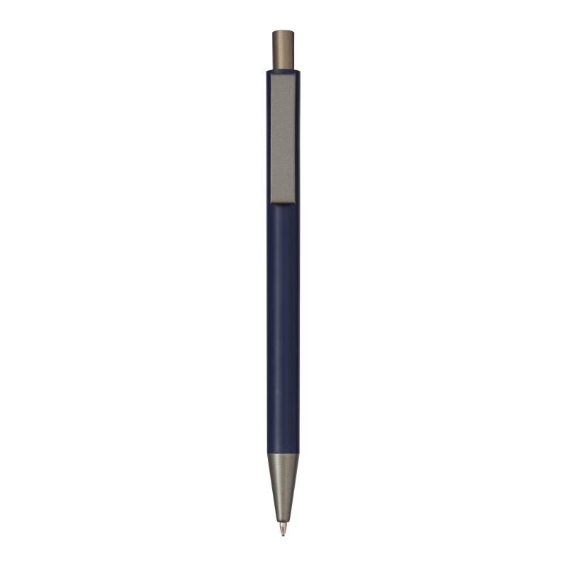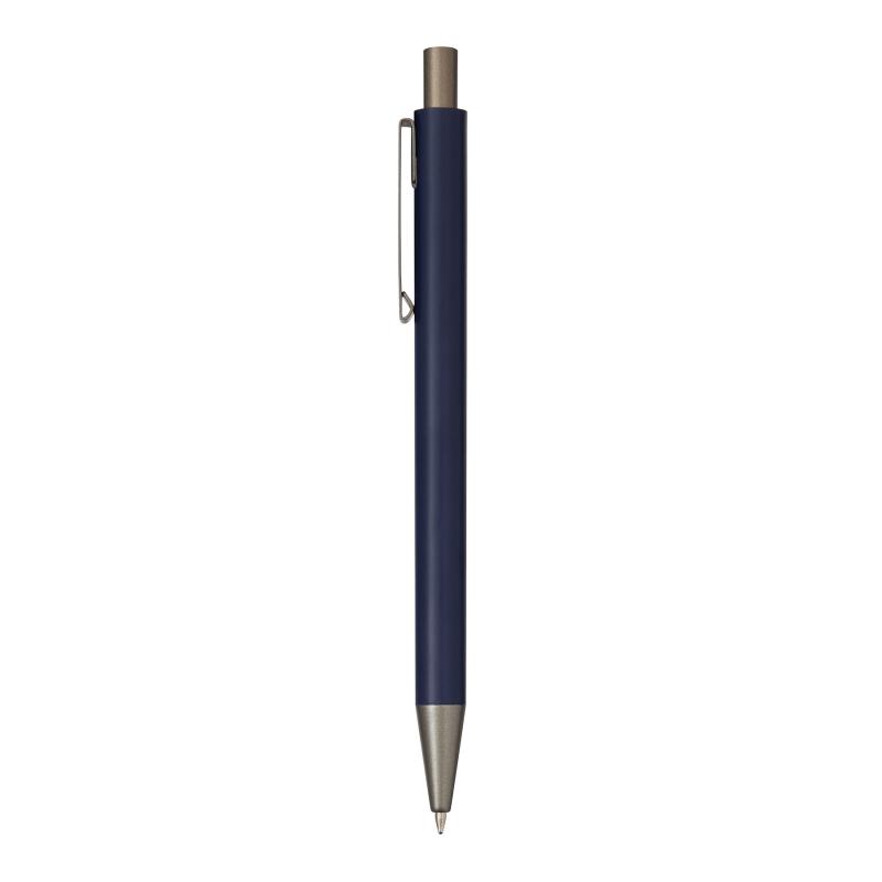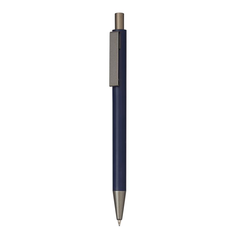 Aluminiowy długopis ALLEGRO. Ma matowy, metalowy korpus, mechanizm typu push, duży wkład z niebieskim tuszem.
