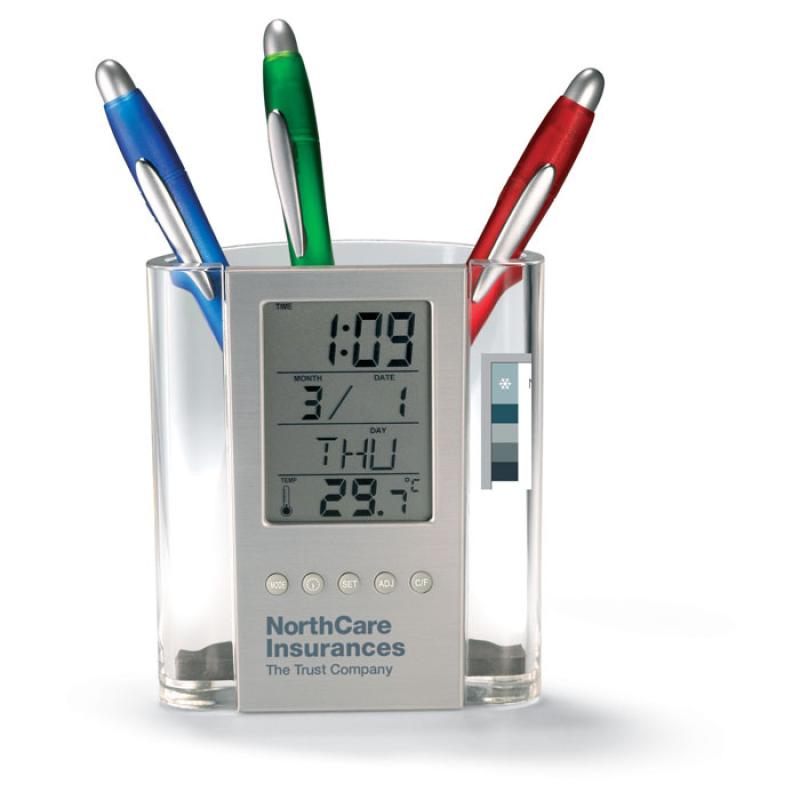 Pojemnik na długopisy z budzikiem, kalendarzem i termometrem. 1 bateria dołączona.
