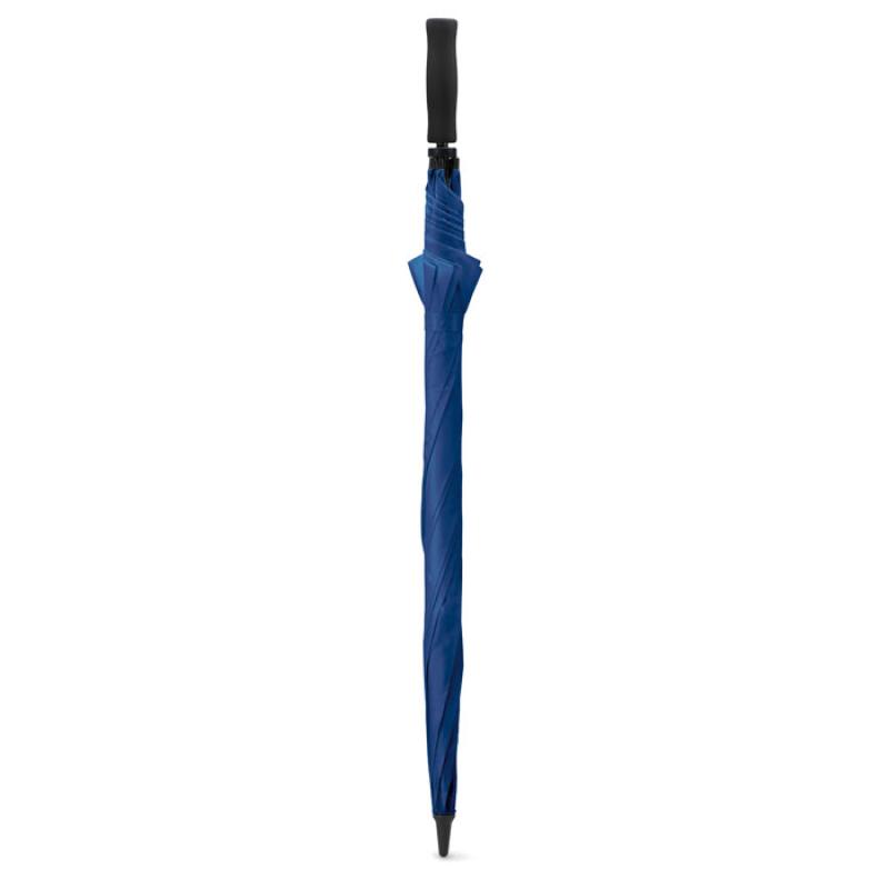 Parasol 30 cali, otwierany ręcznie, odporny na wiatr. Trzon i żebra z włókna szklanego, czarne plastikowe końcówki i szpic. Materiał: poliester 190T. Czarna, prosta rączka z EVA. Zamykany manualnie.