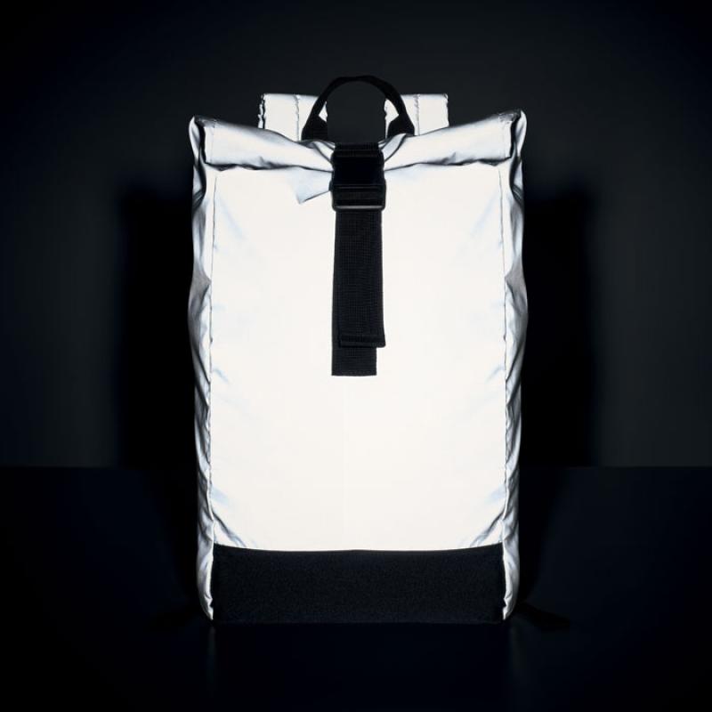 Plecak na laptop 15 cali typu rolltop z odblaskowego poliestru 190T. Dodatkowe zapięcie na rzep. Wyściełane plecy, szelki i spód. Przednia kieszeń na zamek błyskawiczny. Część dolna z poliestru 600D z recyklingu.
