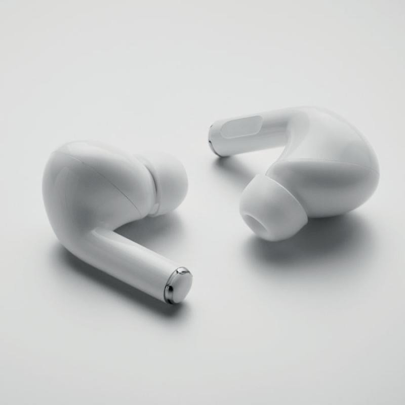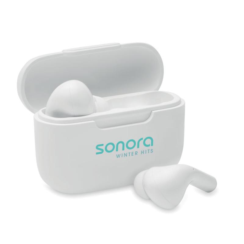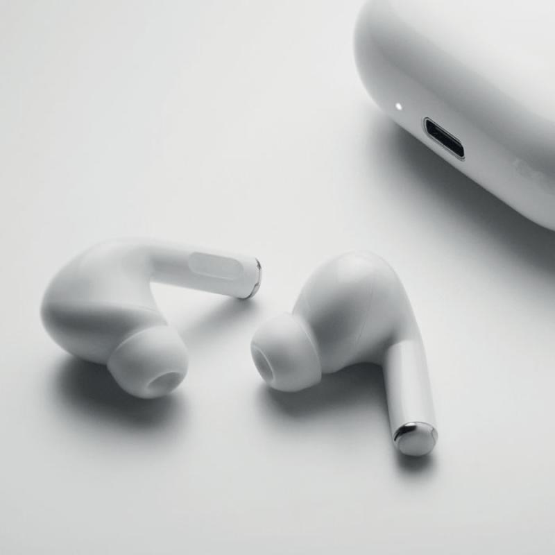 Bezprzewodowe słuchawki douszne z ABS, stereo True Wireless Stereo (TWS) 5.3 z mikrofonem i akumulatorem 30 mAh. Czas odtwarzania około 3 godziny. Wejście typu C. Automatyczne parowanie. W zestawie kabel do ładowania typu C i stacja ładująca 180 mAh.