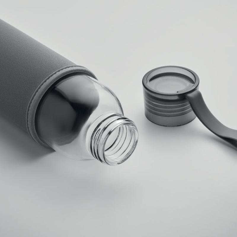 Szklana butelka z recyklingu z neoprenowym etui, z zakrętką z PP i z silikonową zwieszką. Szczelna. Pojemność: 500 ml.