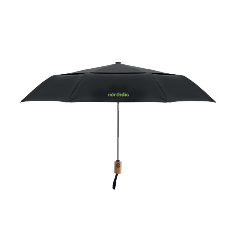 21-calowy, składany, automatycznie otwierany wiatroodporny parasol z materiału 190T polyctotton (70% poliester, 30% bawełna) z aluminiowym trzonem, końcówkami i bambusową rączką. Czarne żebra z włókna szklanego. Zawiera pasujące etui. Automatyczne zamknięcie.