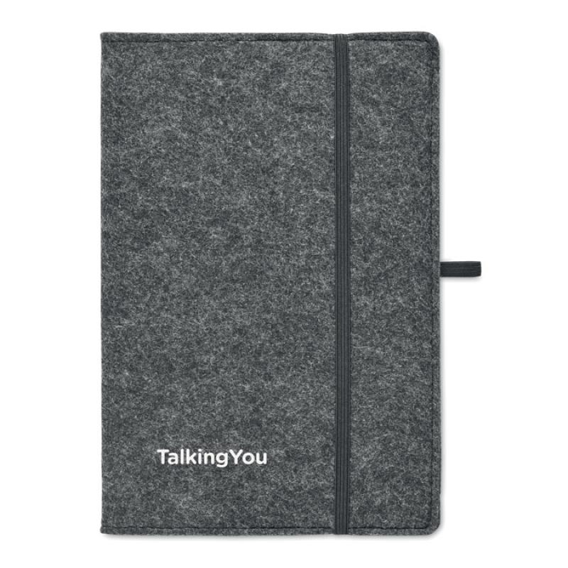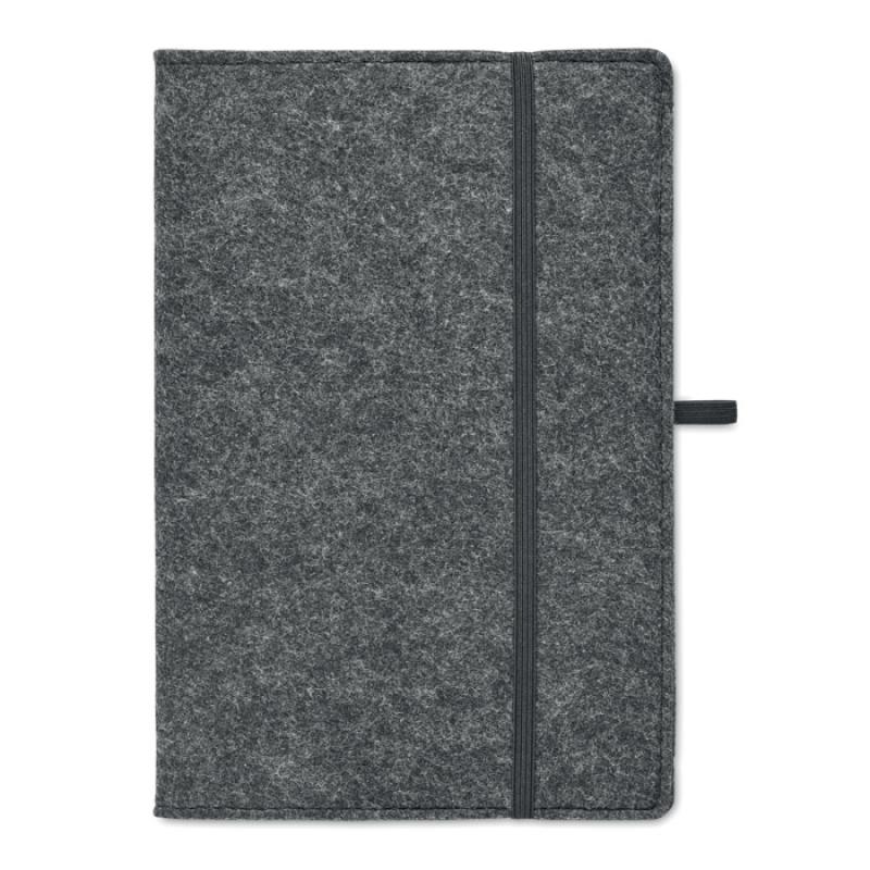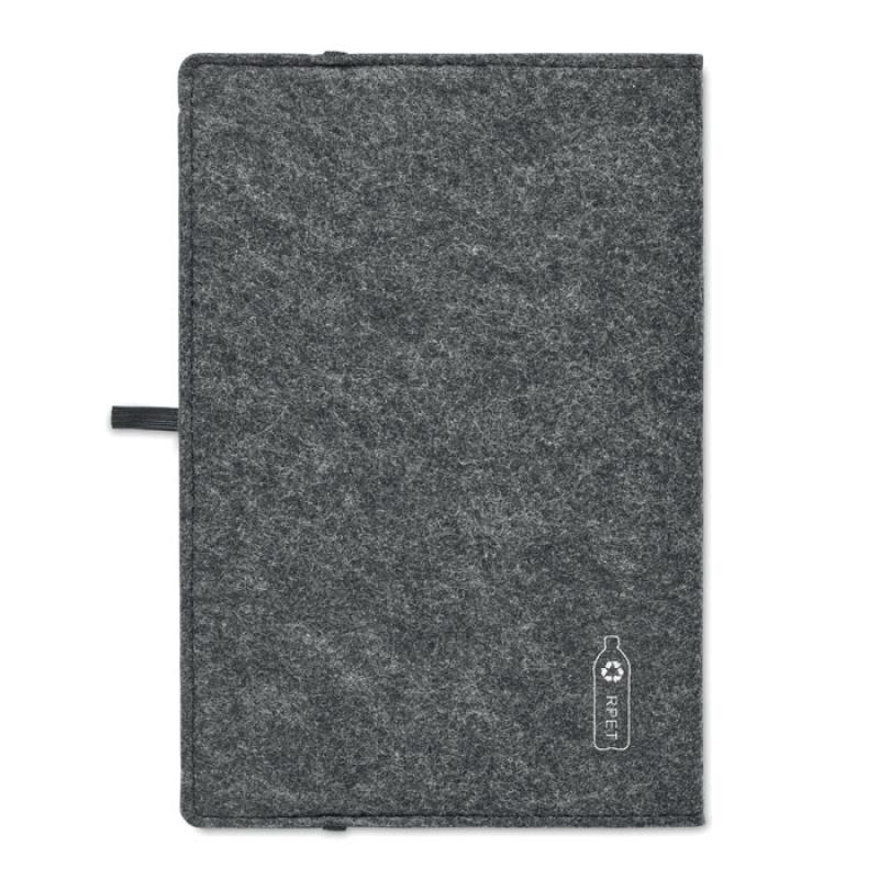 Notes A5 z filcową okładką RPET. 160 stron w linie z papieru z recyklingu (80 arkuszy / 70 gr/m²). Gumka na długopis.
