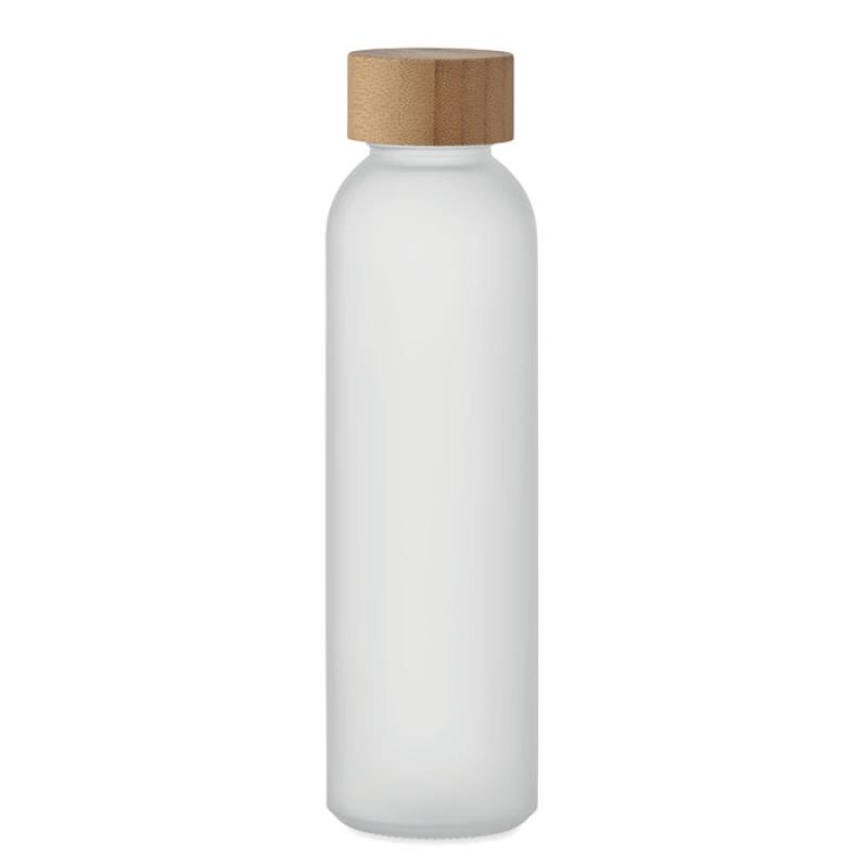 Szklana butelka z matowym wykończeniem i bambusową zakrętką. Szczelna. Pojemność: 500 ml. Bambus jest produktem naturalnym, dlatego mogą występować niewielkie różnice w kolorze i rozmiarze poszczególnych elementów, co może mieć wpływ na ostateczny efekt zdobienia.