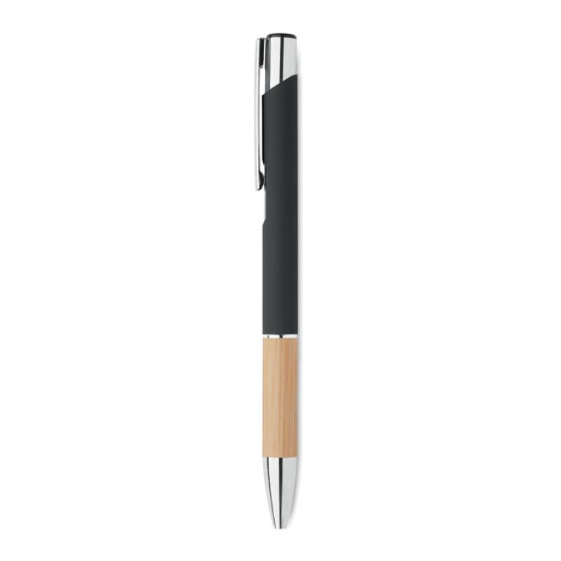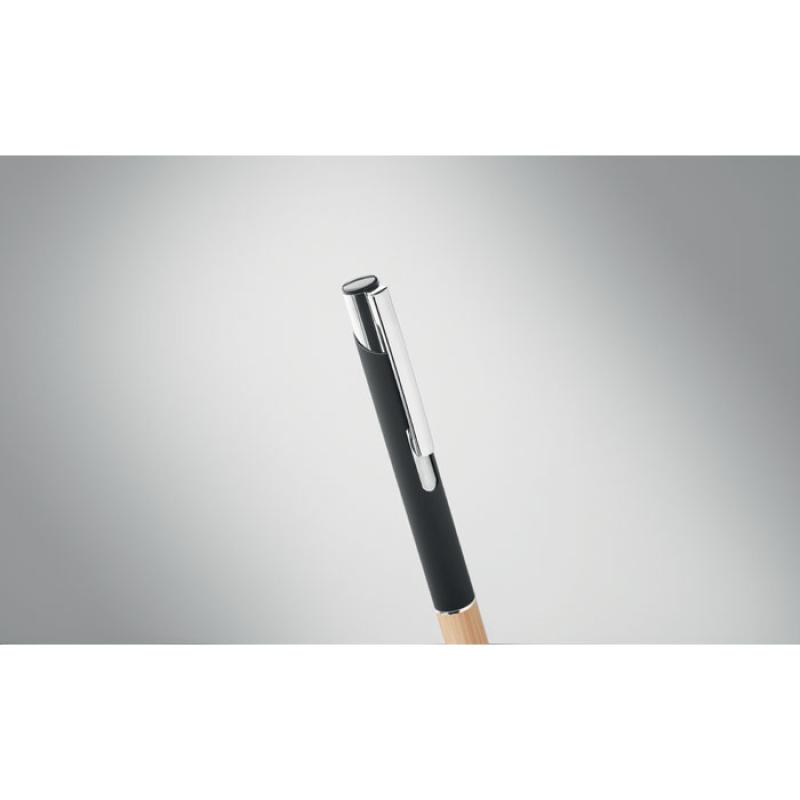 Przyciskany długopis z aluminium z bambusowym uchwytem. Niebieski tusz.