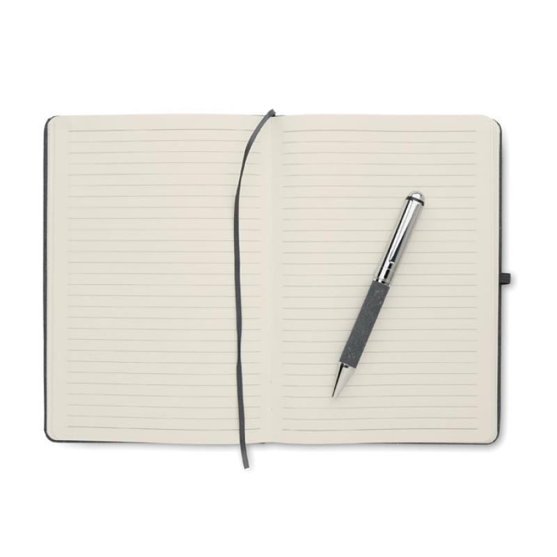 Zestaw upominkowy. Notatnik A5 z twardą okładką, wykonany w 75% ze skóry z recyklingu. Oprawiony. 160 stron w linie (80 kartek)z papieru z recyklingu. Dopasowana gumka zamykająca, wstążkowy znacznik stron i uchwyt na długopis. Dopasowany metalowy długopis. Niebieski tusz. Zapakowany w papierowe pudełko. FSC®-certified | FSC MIX CREDIT, P7.1, FSC-C213206