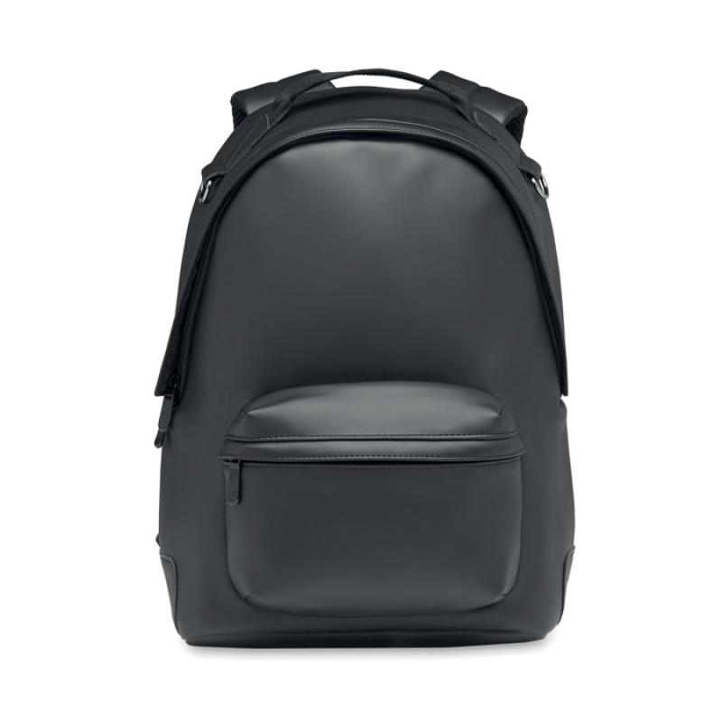 15-calowy plecak na laptopa z miękkiego PU z wyściełanym tyłem i wzmocnioną podstawą. Przednia kieszeń zapinana na zamek. Podszewka 210D RPET.