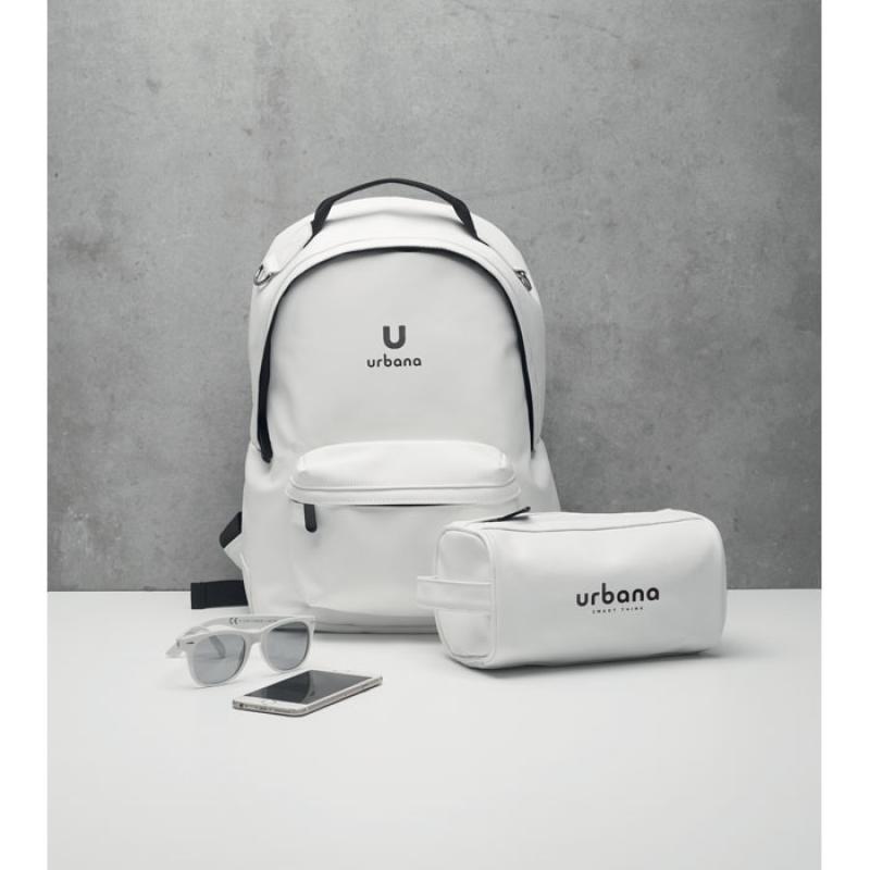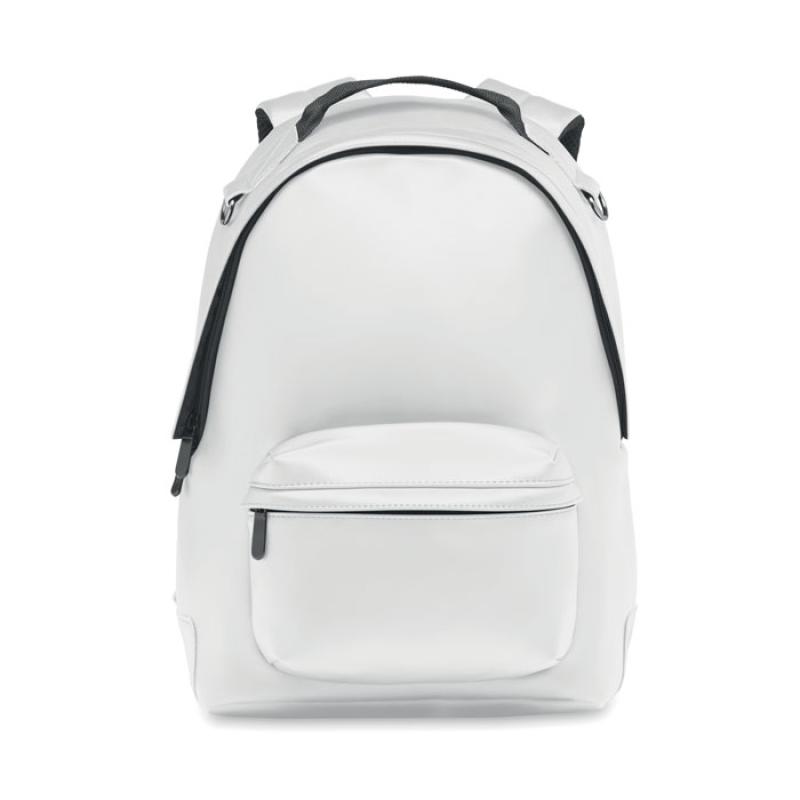 15-calowy plecak na laptopa z miękkiego PU z wyściełanym tyłem i wzmocnioną podstawą. Przednia kieszeń zapinana na zamek. Podszewka 210D RPET.