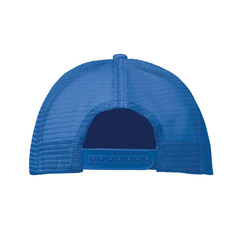 5-panelowa czapka typu trucker z regulowanym zapięciem na plastikowy zatrzask. Biały przedni panel oraz kolorowy daszek wykonany z poliestru i pianki (140-150 gr/m2 ). Pozostałe panele z kolorowej siatki. Rozmiar 7 1/4.