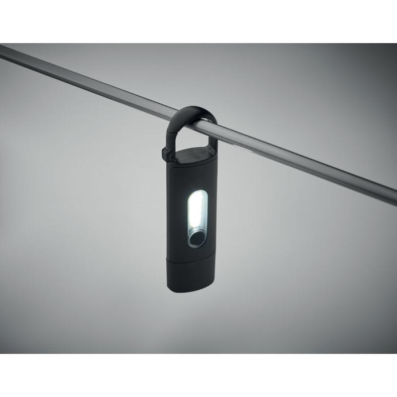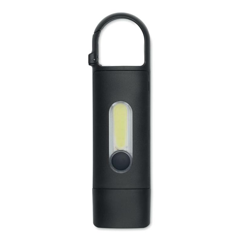 Kieszonkowa latarka akumulatorowa COB z karabińczykiem z tworzywa ABS. Światło awaryjne i 3 tryby oświetlenia. 1 x akumulator litowy 3,7 V, 200 mAh (w zestawie, niewymienialny).