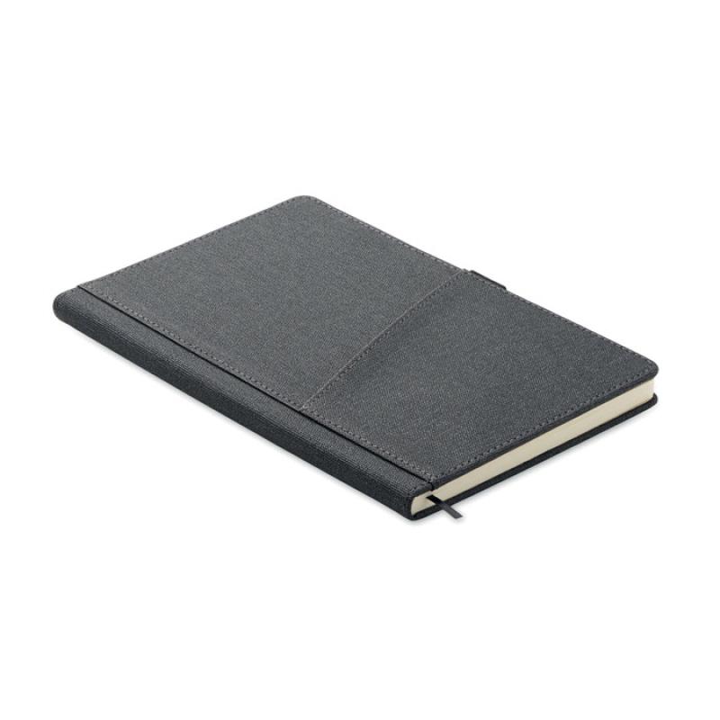 Notatnik A5 w twardej okładce z PU z kieszenią na telefon z przodu. Obwoluta. 160 stron w linie (80 kartek) z papieru z recyklingu. Dopasowana zakładka wstążkowa. FSC®-certified | FSC MIX CREDIT, P7.1, FSC-C213206