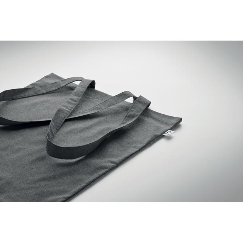 Bawełniana torba na zakupy z prekonsumenckiego recyklingu (70% bawełny z recyklingu i 30% RPET) z długimi uchwytami. 140 gr/m². Ten produkt może się kurczyć po zadrukowaniu.