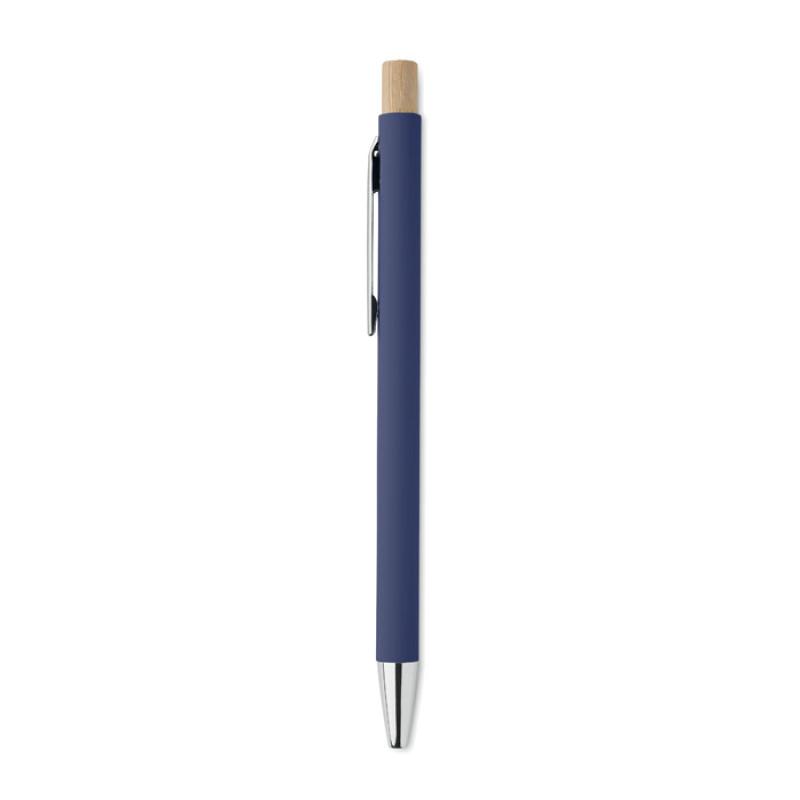 Aluminiowy długopis z recyklingu. Srebrna końcówka i klip. Niebieski tusz.
