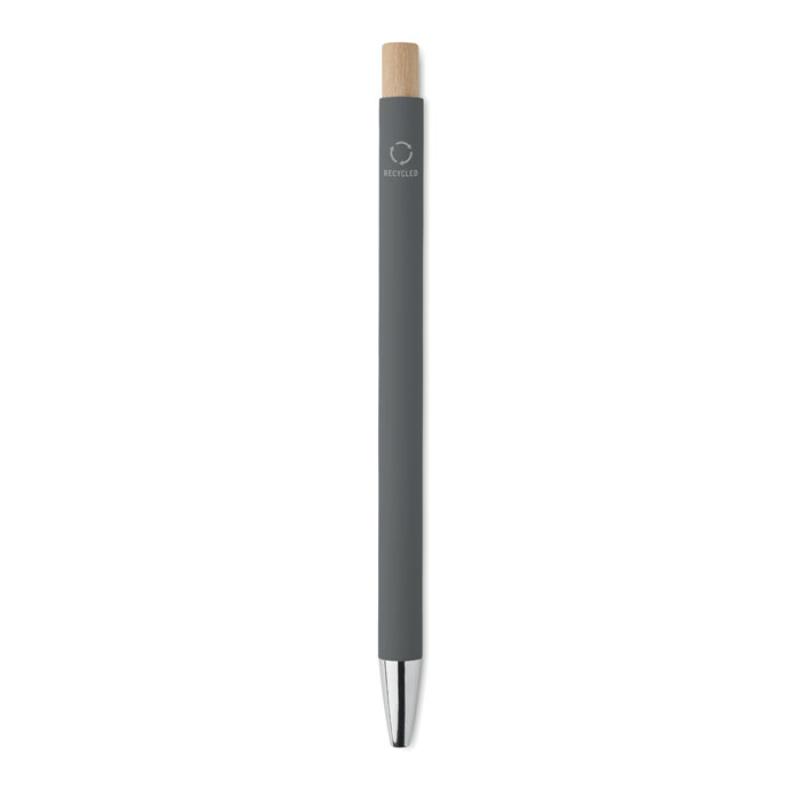 Aluminiowy długopis z recyklingu. Srebrna końcówka i klip. Niebieski tusz.