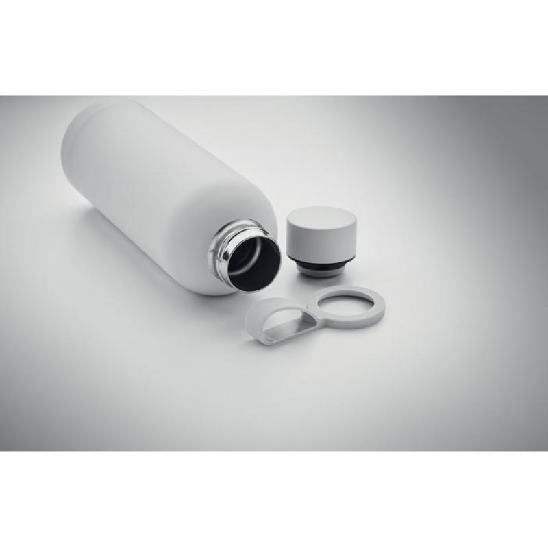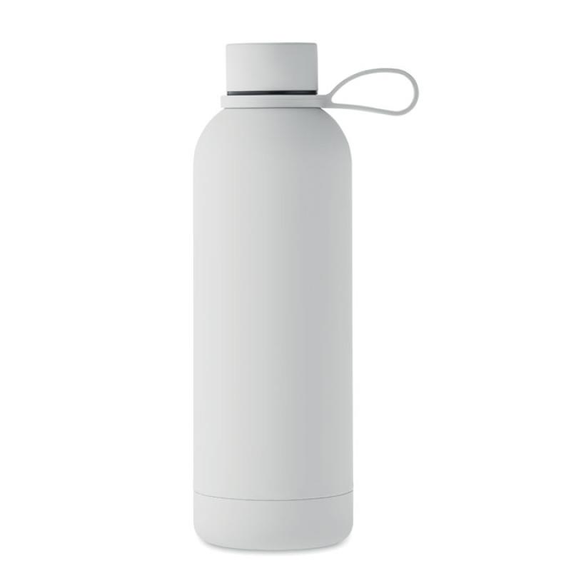 Dwuścienna butelka z izolacją próżniową z recyklingowanej stali nierdzewnej (90% z recyklingowanej stali nierdzewnej i 10% ze stali nierdzewnej) z gumowym wykończeniem i silikonowym uchwytem. Pojemność: 500 ml.