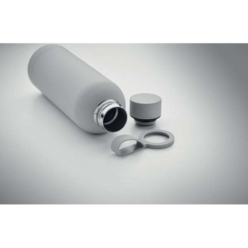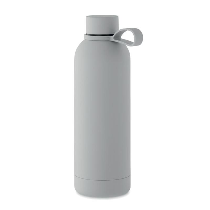 Dwuścienna butelka z izolacją próżniową z recyklingowanej stali nierdzewnej (90% z recyklingowanej stali nierdzewnej i 10% ze stali nierdzewnej) z gumowym wykończeniem i silikonowym uchwytem. Pojemność: 500 ml.