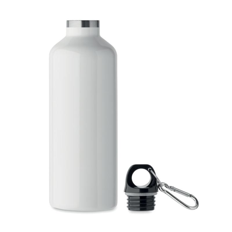 Dwuścienna butelka z izolacją próżniową wykonana ze stali nierdzewnej z recyklingu (90% stali nierdzewnej z recyklingu i 10% stali nierdzewnej) z zakrętką z karabińczykiem. Pojemność: 500 ml.