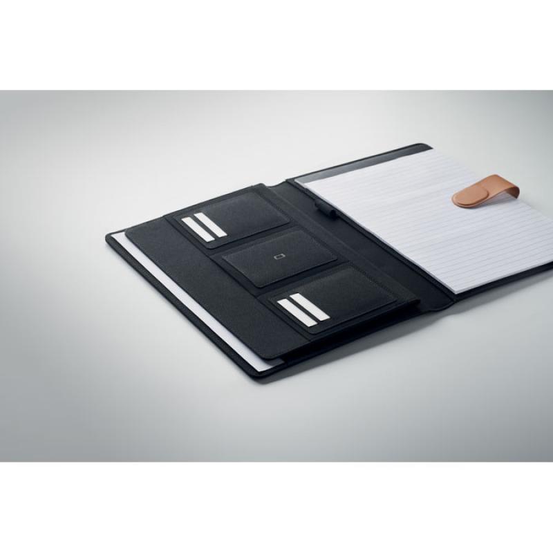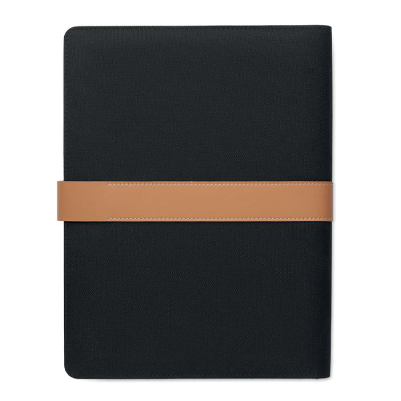 Teczka A4 z RPET z detalami ze sztucznej skóry. Wymienialny notatnik A4. 30 stron w linie z papieru z recyklingu. Uchwyt na długopis. 4 uchwyty na karty, 3 małe kieszenie i jedna duża przegroda. Magnetyczne zapięcie na pasek. FSC®-certified | FSC MIX , P8.6, FSC-C213206