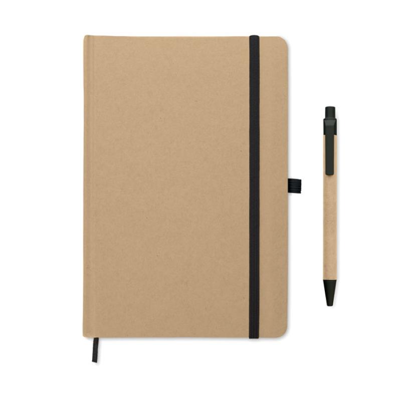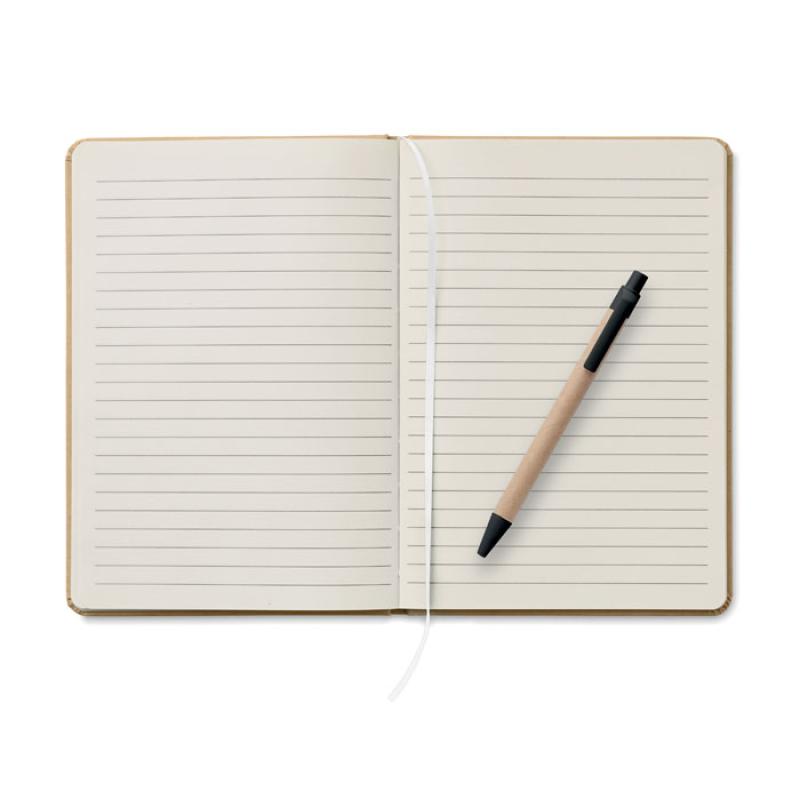 Notatnik A5 z twardą okładką z kartonu pochodzącego z recyklingu. 160 stron w linie (80 arkuszy papieru z recyklingu). Elastyczny pasek zamykający i pętelka na długopis, zakładka ze wstążki, długopis z przyciskiem i korpusem z papieru z recyklingu. Niebieski tusz.