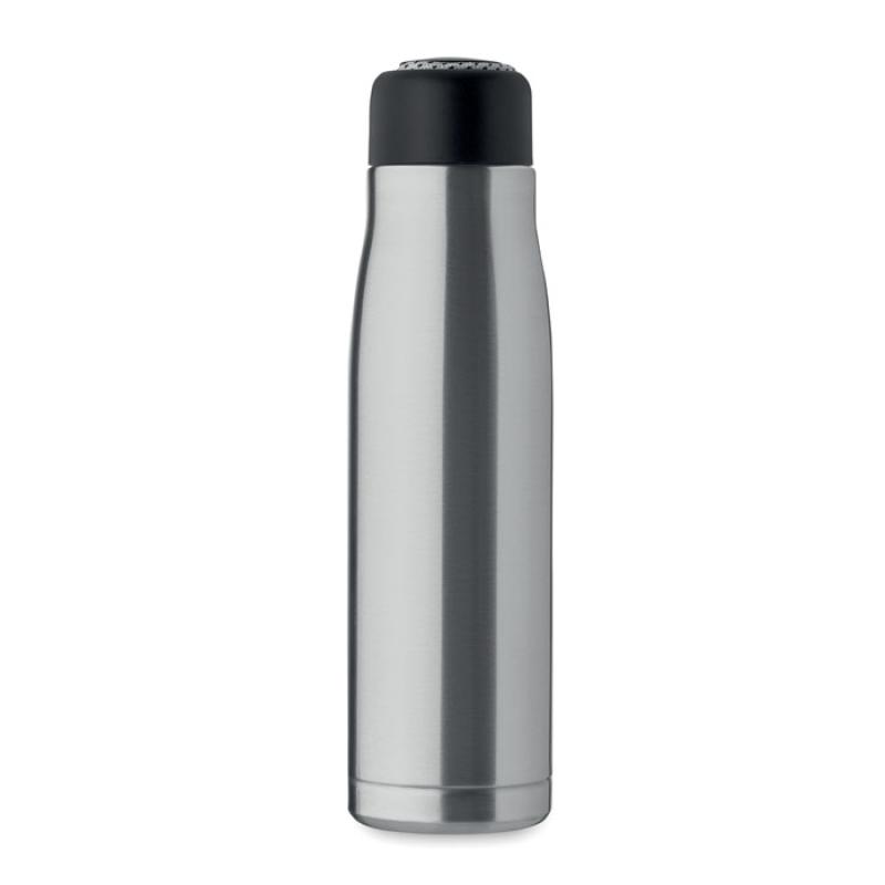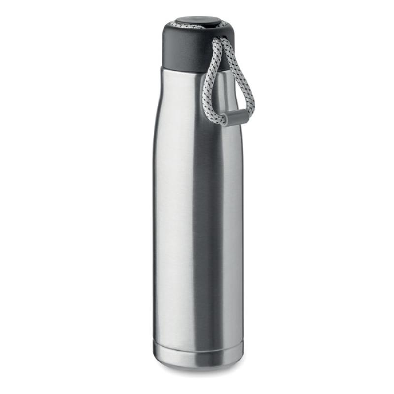 Izolowana próżniowo butelka z podwójnymi ściankami z recyklingowanej stali nierdzewnej (90% z recyklingowanej stali nierdzewnej i 10% ze stali nierdzewnej) ze zintegrowanym uchwytem sznurkowym w zakrętce z PP. Nie przecieka. Pojemność: 500 ml.