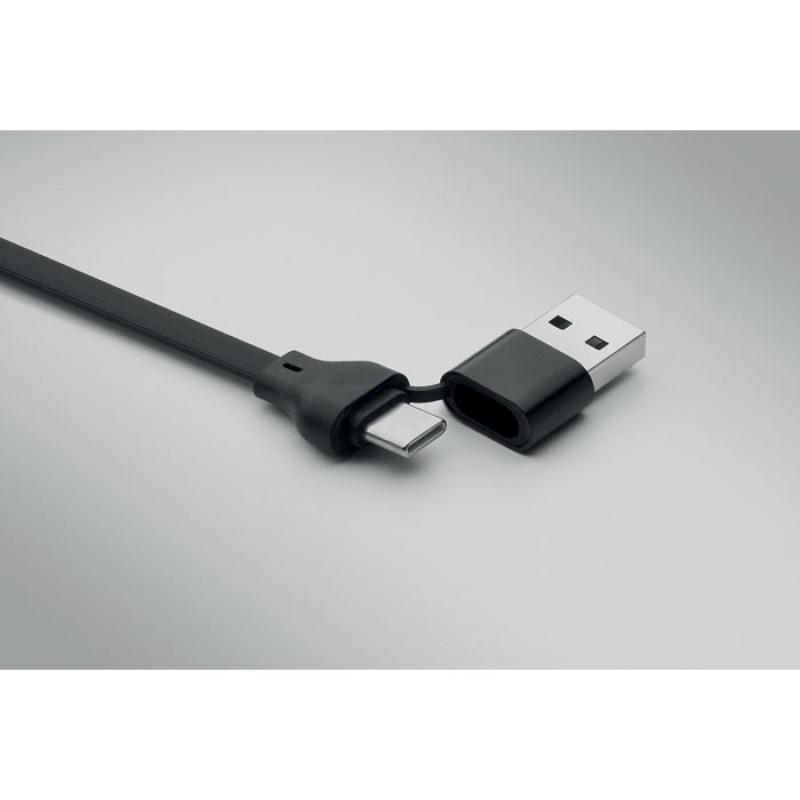 Kabel o mocy 60 W w obudowie z recyklingowanego ABS z brelokiem i podstawką na telefon. Wejście: 2-w-1 Typ-C i Typ-A. Wyjście: Typ-C i micro-B (2 w 1 pin). Długość kabla: 26 cm.