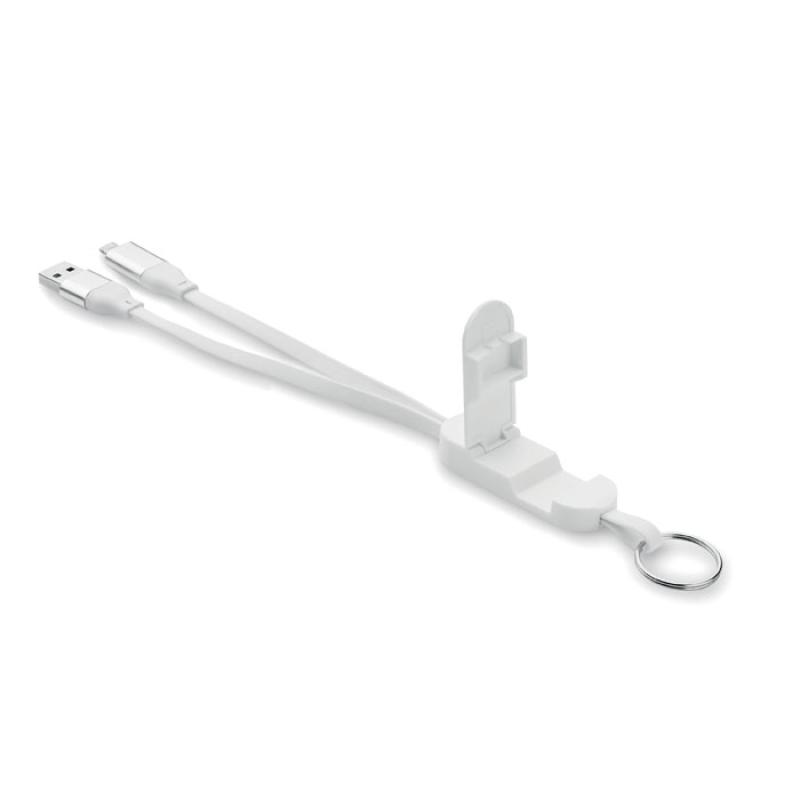 Kabel o mocy 60 W w obudowie z recyklingowanego ABS z brelokiem i podstawką na telefon. Wejście: 2-w-1 Typ-C i Typ-A. Wyjście: Typ-C i micro-B (2 w 1 pin). Długość kabla: 26 cm.