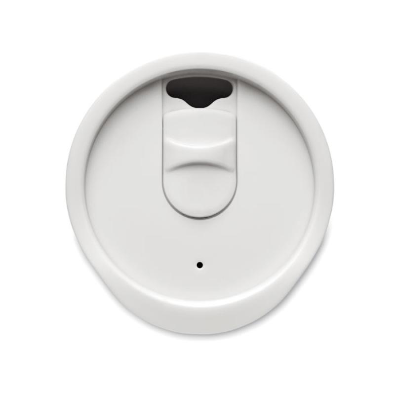 Kubek o podwójnych ściankach z PP z korkową podstawą i zamykaną pokrywką z ustnikiem z PS. Pojemność: 300 ml.