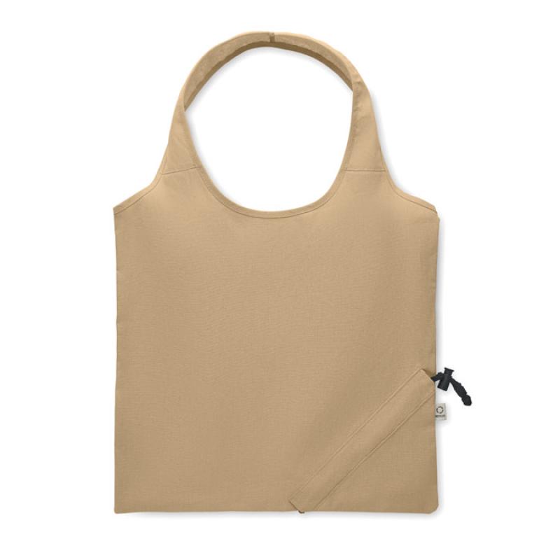 Składana torba na zakupy z bawełny pochodzącej z recyklingu (70% bawełny z recyklingu i 30% RPET). 140 gr/m². Ten produkt może się kurczyć po zadrukowaniu.