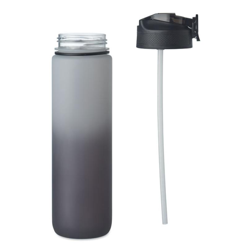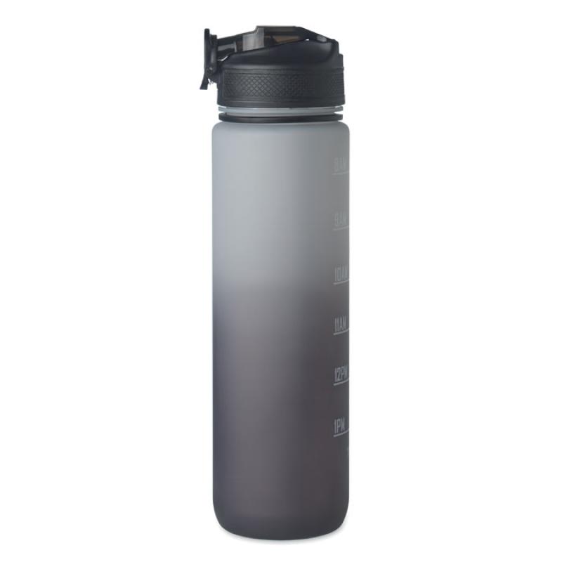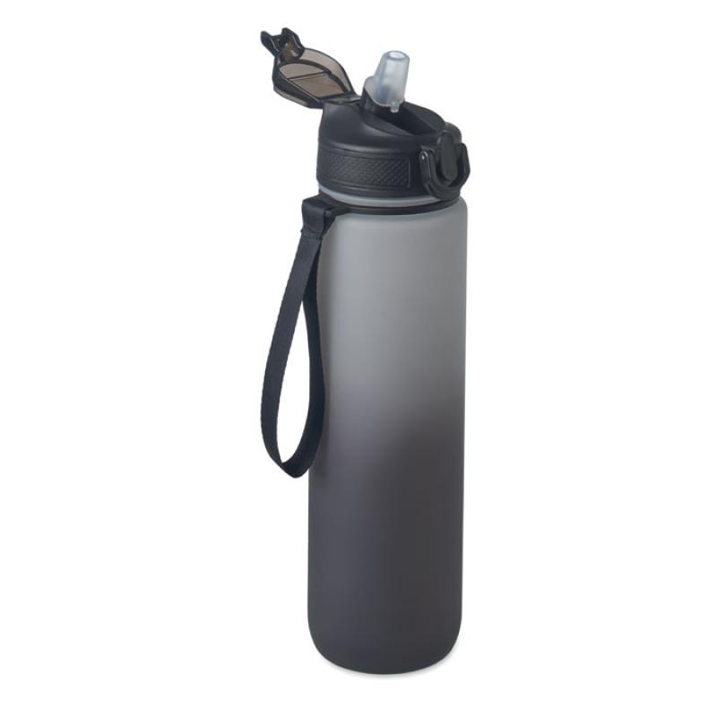 Sportowa butelka na wodę z RPET ze zintegrowaną słomką, miękkim silikonowym ustnikiem, motywacyjnym oznaczeniem czasu, otwieraną jedną ręką klapką, blokadą bezpieczeństwa i paskiem do przenoszenia. Pojemność 1 l. Szczelna.