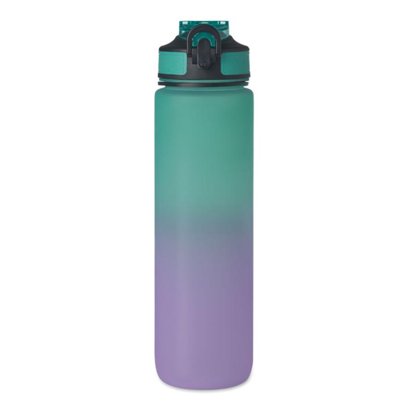 Sportowa butelka na wodę z RPET ze zintegrowaną słomką, miękkim silikonowym ustnikiem, motywacyjnym oznaczeniem czasu, otwieraną jedną ręką klapką, blokadą bezpieczeństwa i paskiem do przenoszenia. Pojemność 1 l. Szczelna.