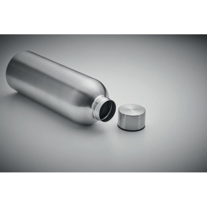 Jednościenna butelka wykonana ze stali nierdzewnej pochodzącej z recyklingu (90% stali nierdzewnej pochodzącej z recyklingu i 10% stali nierdzewnej). Nie przecieka. Pojemność 750 ml. Ponieważ jest to butelka z pojedynczą ścianką, może dochodzić do wymiany ciepła.