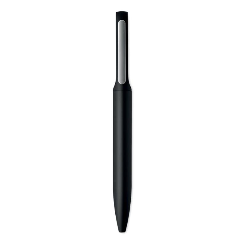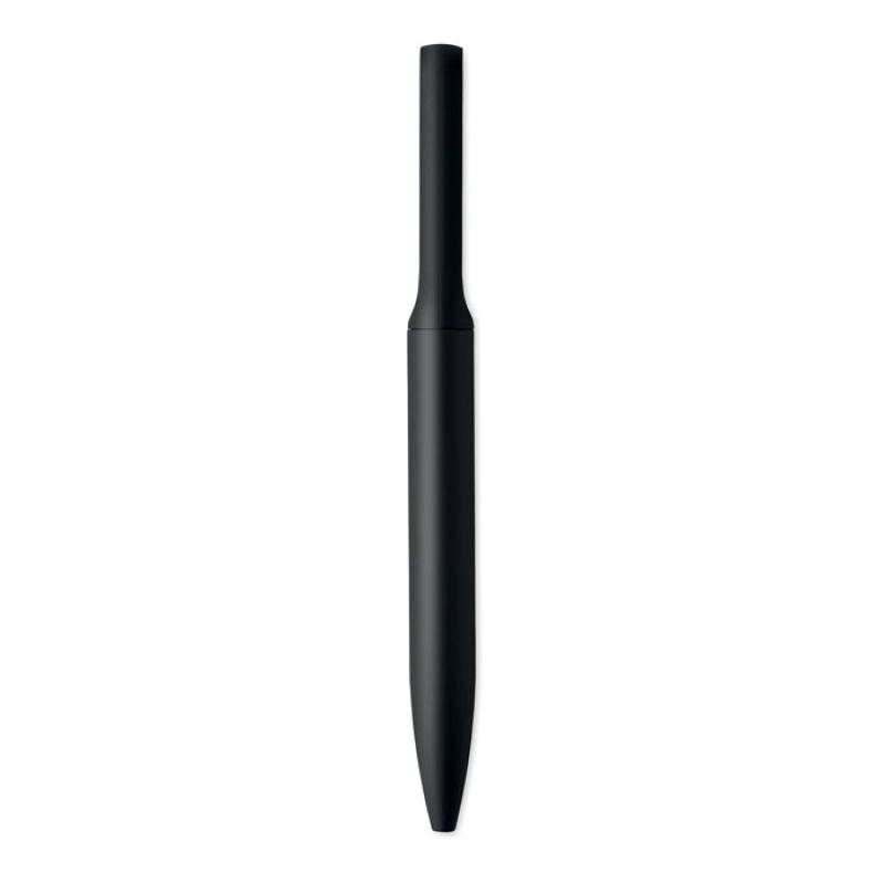 Obrotowy długopis z aluminiowym korpusem z recyklingu, częścią obrotową z recyklingowanego ABS i metalowym klipsem z bambusowym detalem. Niebieski tusz.