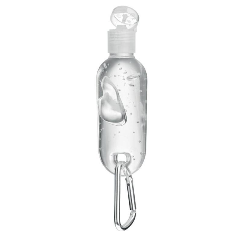 Żel do mycia rąk w butelce wielokrotnego użytku z PET z nakrętką z klapką i karabińczykiem. Pojemność 30 ml.