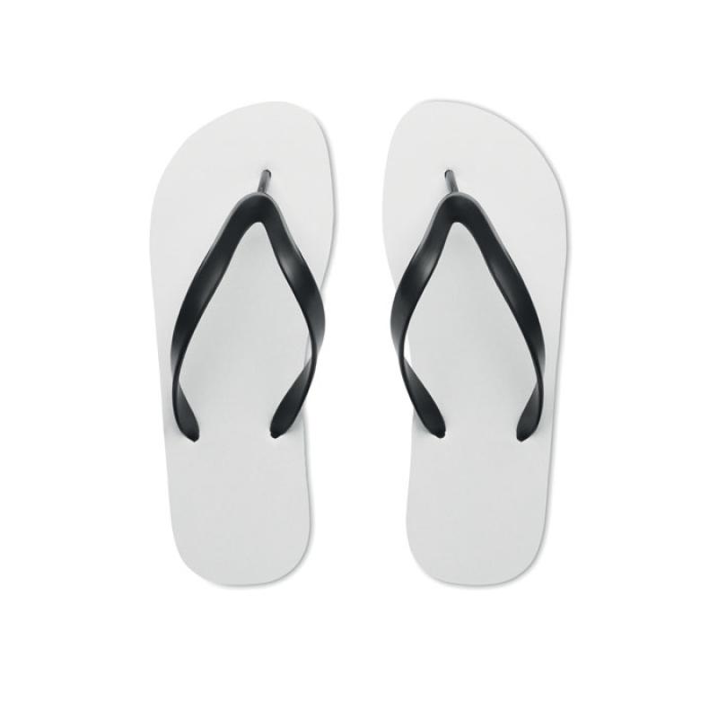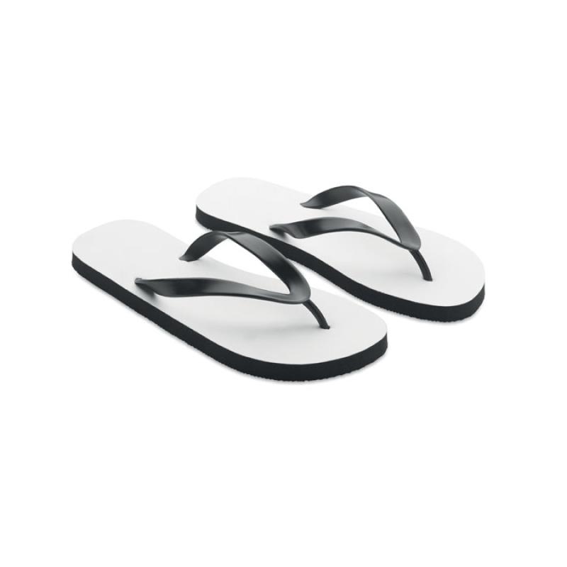 Klapki plażowe do sublimacji z paskami z PVC. Podeszwa wykonana z gumy z wierzchnią tkaniną poliestrową. Rozmiar 38-41. Przedmiot może być zamówiony wyłącznie z nadrukiem.